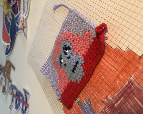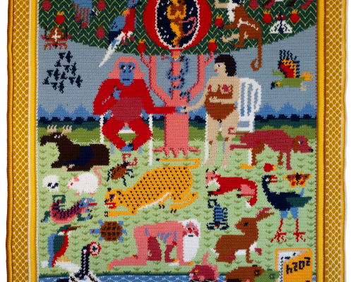 Vor mehreren Semestern entdeckte ich das Häkeln als Technik für meine Bildproduktion. Ausgangspunkt für die Thesis waren Wandteppiche mit Paradiesdarstellungen des Mittelalters und der Renaissance. Vor allen Dingen Hieronymus Boschs Triptychon „Garten der Lüste“ inspirierte mich farblich und thematisch. Es wurde dann ein großer Spaß, ein inhaltlich ambivalentes Paradies zu gestalten, in das ich eine Fülle von Bildzitaten einarbeiten konnte, von Jan van Eyck, Jan Bruegel d. Ä., Peter Paul Rubens und Maria Sibylla Merian, über William Blake und Henri Rousseau, bis hin zu Anita Albus und Stanley Kubrick.