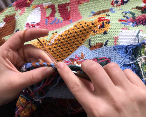 Several semesters ago I discovered crocheting as a technique for my image production. The starting point for the thesis were tapestries with depictions of paradise from the Middle Ages and the Renaissance. Above all, Hieronymus Bosch's triptych “Garden of Earthly Delights” inspired me in terms of color and theme. It was then great fun to create a paradise with ambivalent content, into which I was able to incorporate a wealth of image quotations from Jan van Eyck, Jan Bruegel the Elder. Ä., Peter Paul Rubens and Maria Sibylla Merian, from William Blake and Henri Rousseau to Anita Albus and Stanley Kubrick.