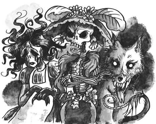 I have always been fascinated by the aesthetics of the macabre. Since there is hardly anything more macabre than death itself, this theme was chosen. I wanted to delve deeply into character design and researched personifications of death from different cultures and eras. I quickly realized that an interaction between these characters was more interesting than if they were all just individually illustrated. To do this, I wrote a story in which the Deaths hold a conference to accept a new Death, the “Cyber Death,” into their community.