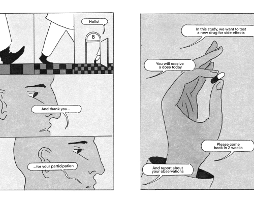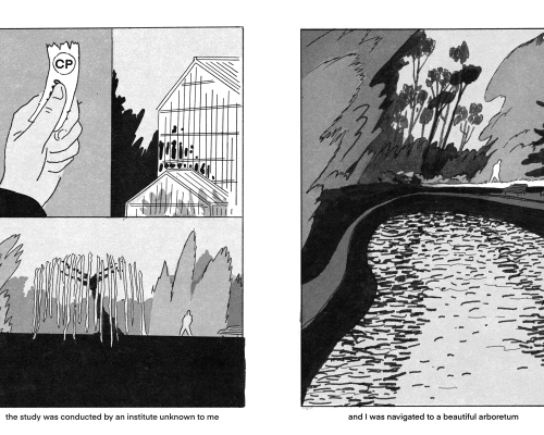 Das Unheimliche ist eher in unbewohnten Landschaften als im bewohnten Raum. Diese Leere habe ich in den Bildern der Geschichte genutzt, es ist keine andere Person außerhalb des Protagonisten und seiner eingebildeten Ärzte und Krankenschwestern zu sehen, er ist allein mit seiner Psyche. Freud schreibt, „das Unheimliche sei jene Art des Schreckhaften, welche auf das Altbekannte, Längstvertraute zurückgeht.“ Für die Szenerie der Bildgeschichte habe ich Referenzen aus meinem Umfeld genutzt, das Gewächshaus und Arboretum der Kieler Universität und Gebäude aus meiner Nachbarschaft.