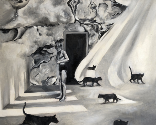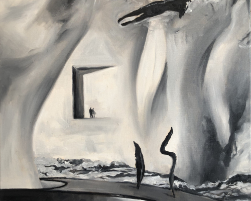 Multiperspectivity, impossible perspectives and spaces as well as irritating visual worlds seemed to best capture the dream theme and make it tangible. To do this, individual elements were cut out of photos and reassembled. This is how the strange compositions and image content of the paintings came about. The meaning of the individual elements must not be explained. Whether there is any meaning behind the representations is irrelevant. What is important is that the unusual imagery with dream analogies triggers the recipient's thought process.